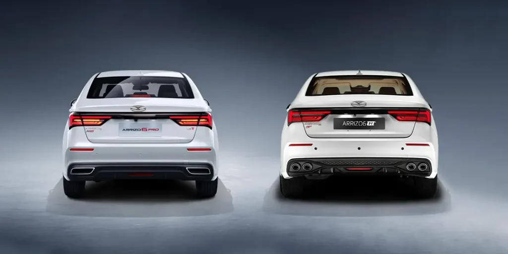 در نگاه کلی طراحی عقب این دو خودرو بسیار به یکدیگر شباهت دارند و تنها جزییات است که آن‌ها را از هم متمایز می‌کند. چراغ‌های عقب خودروهای آریزو ۶ پرو و آریزو ۶ جی‌تی به هم پیوسته هستند و لوگوی فونیکس بر روی درب صندوق این خودروها قرار گرفته است. اما تفاوت طراحی قسمت عقب سری ۶ آریزو به انتهای سپر برمی‌گردد، جایی که دیفیوزر آریزو۶ جی‌تی مجهز به خروجی دوگانه در دو سمت سپر شده است. در حالی که در آریزو ۶ پرو خروجی‌های لوزی شکل را می‌بینیم، به طور کلی در بحث طراحی خارجی آریزو ۶ جی‌تی سعی بر آن بوده حس اسپرت بودن به این خودرو منتقل شود که طراحان کاملا موفق عمل کرده‌اند.