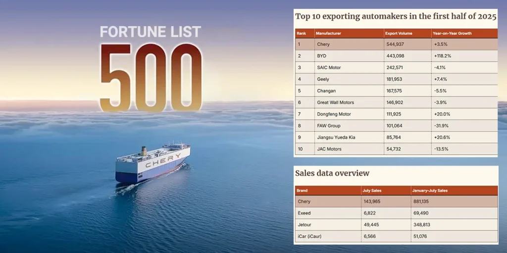 طبق دادههای پایگاه Yiche، سه مقصد برتر صادرات خودرو چین در نیمه اول سال ۲۰۲۵، مکزیک، امارات متحده عربی و روسیه بودند که به ترتیب حجم صادرات ۲۳۴,۵۰۰ دستگاه، ۲۱۴,۳۰۰ دستگاه و ۱۷۱,۰۰۰ دستگاه بود. آمار میگوید صادرات به مکزیک نسبت به سال گذشته ۳۰.۷ درصد افزایش داشته و از آن بیشتر امارات متحده عربی بوده با ۵۸.۵ درصد افزایش اما صادرات خودروهای ساخت چین به روسیه ۵۹.۲ درصد کاهش یافته است.
