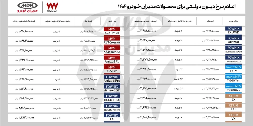 با این حال فهرست قیمت محصولات مدیران خودرو با احتساب نرخ جدید دیون دولتی برای 1404 و اعمال افزایش آن نسبت به نرخ 1403، اعلام می‌شود.