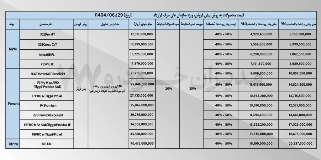 در روش اول که با پرداخت دو مرحلهای و با قیمت غیرقطعی است، 12 مدل از خودروهای مدیران خودرو از سه برند ام وی ام، فونیکس و اکستریم در نظر گرفته شده که با پیشپرداخت متغیر (از 40 تا 50 درصد) قابل خرید برای متقاضیان خواهد بود.