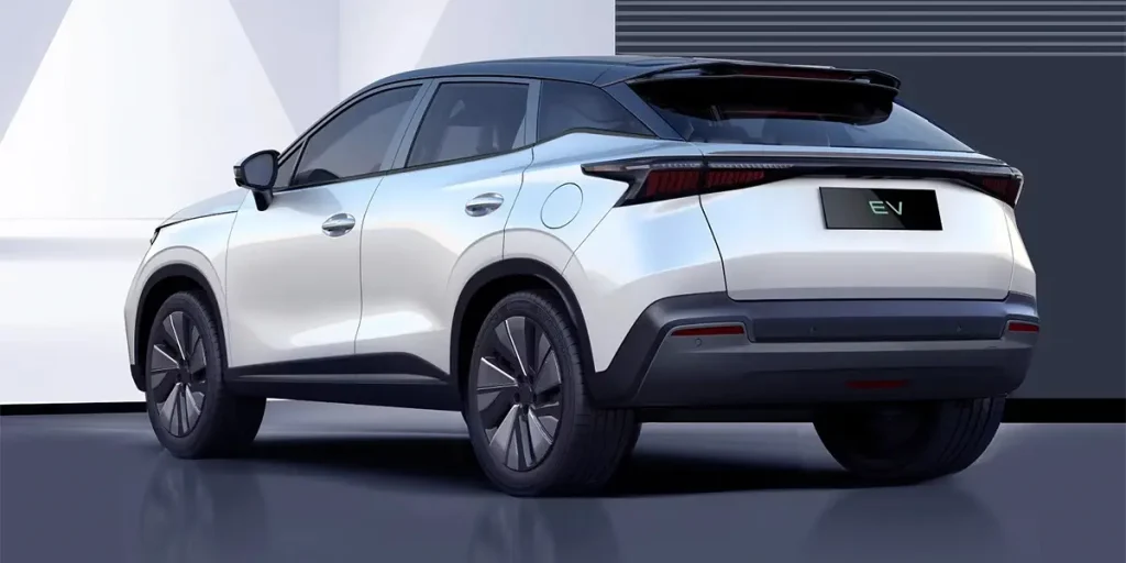 از نمای جانبی به جز تغییر فرم رینگهای آلیاژی، تفاوت دیگری با مدل بنزینی احساس نمیشود و نهایتا در قسمت انتهایی اف ایکس برقی نیز شکل سپر عقب به دلیل حذف اگزوز و دیفیوزر تغییر کرده و نصب نشان نسبتا بزرگ EV بر الکتریکی بودن این خودرو تاکید دارد.