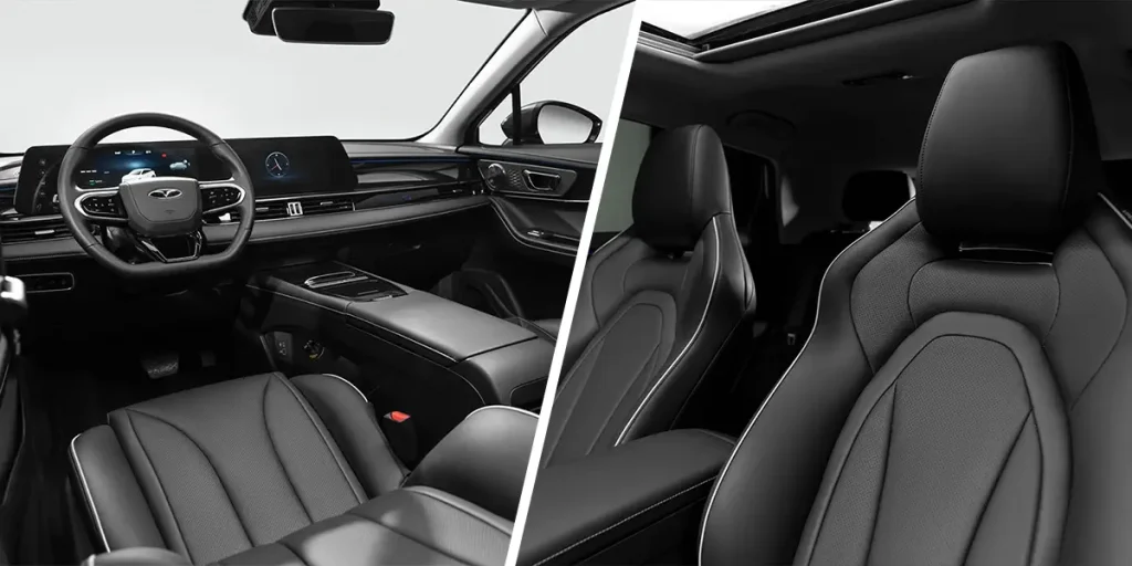 مبلمان اف ایکس برقی شبیه به مدل پایه و متشکل از متریال چرمی به رنگ مشکی است که حالت اسپرتی را در این خودرو مضاعف میکند.